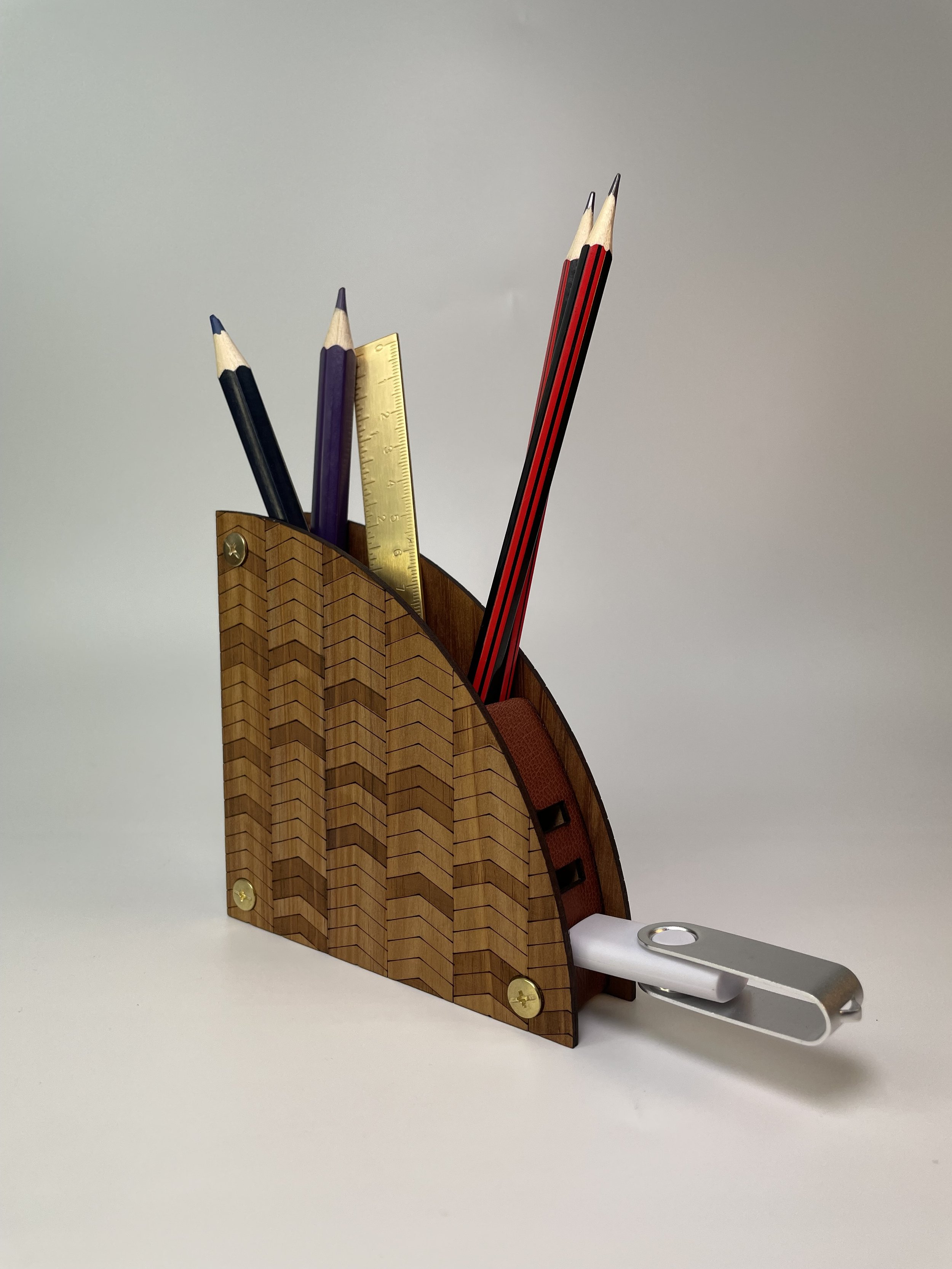 We select high quality Australian grown timbers. It is produced in flat sheets for us, after which the fun starts. We digitally design each product, including the cuts and etchings for each. We then use a high-powered CO2 laser to cut and etch the flat sheets of timber. When the laser is done, we sand and treat the timber to protect and highlight its beauty. We then complete the assembly by hand, which may include elastic, rivets, Chicago screws and leather depending on the product.